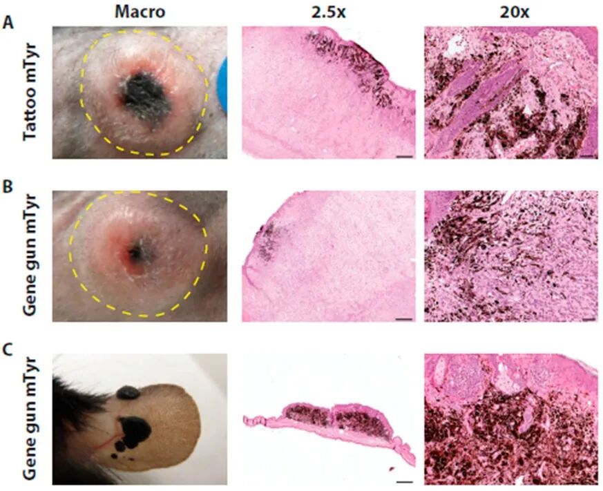 角质形成细胞(Keratinocytes)是表皮的主要细胞,占表皮细胞成分的95%。该细胞起源于基底层,分裂后逐渐向上移动,伴随着细胞的成熟和分化,细胞逐渐扁平化并富含角蛋白;最终,表层的角质形成细胞会脱落,形成角质层,起到保护皮肤的作用。K14和BK5基因与角质形成细胞中的基底层细胞有关,分别编码角蛋白14和角蛋白5,是基底层角质形成细胞的重要组成部分。因此K14/BK5启动子可以特异性靶向基底层角质形成细胞。K10基因主要在基底层之上、分化的角质形成细胞中表达,编码分化标志物角蛋白10,与角质化过程密切相关。因此K10启动子可以特异性靶向分化的角质形成细胞。黑色素细胞(Melanocytes)位于表皮的基底层,负责产生黑色素(即皮肤的主要色素成分),保护皮肤免受紫外线伤害。mTyr启动子是小鼠黑色素细胞特异性酪氨酸酶启动子。