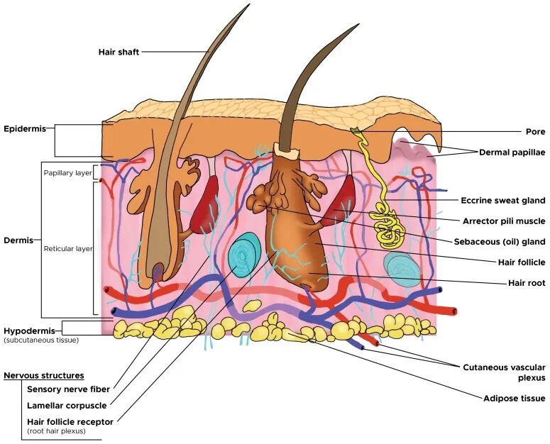 皮肤(Skin)是人体最大的器官,覆盖整个外表面,能够抵御病原体、紫外线、化学物质和机械损伤,还能够感知外界刺激、调节温度和维持水分。皮肤通常分为表皮、真皮和皮下组织三层。表皮(Epidermis)是皮肤的最外层,是抵御外部环境的第一道防线,从最表层到最深层又可分为角质层、透明层、颗粒层、棘层和基底层。表皮本身没有血液供应,从其下面的真皮中获取营养。真皮(Dermis)是支撑表皮的下层结缔组织层,由乳头层和网状层组成,两层融合在一起且没有明显的界限。真皮内有毛发、腺体、血管、神经末梢等。皮下组织(Hypodermis)是皮肤的最深层,通过胶原蛋白和弹性蛋白纤维与真皮直接相连。其中包含脂肪小叶、血管、神经等结构,是体内脂肪储存的主要部位。