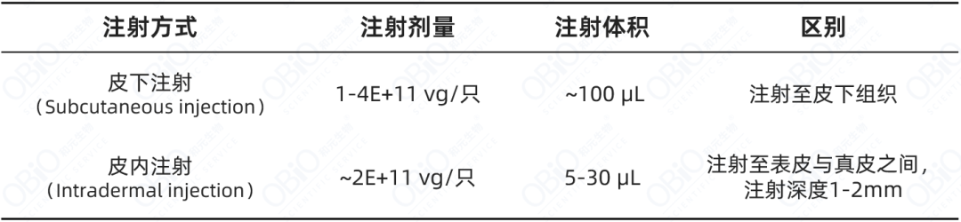 在AAV介导的皮肤基因递送中,最常用到的注射方式是皮下注射和皮内注射。具体的注射方式和注射剂量参考下表。