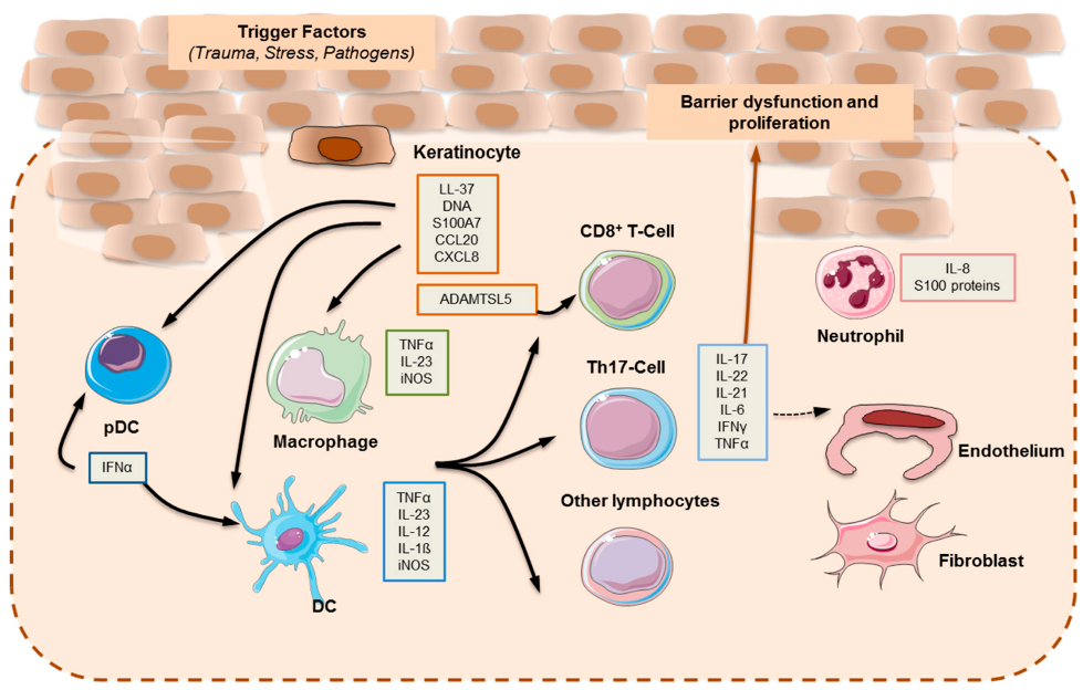 由于遗传因素、环境因素等多种原因,皮肤相关疾病是人类日常生活中较为常见和常发的疾病,并且多为慢性疾病。银屑病(Psoriasis)也叫牛皮癣,是一种慢性炎症性皮肤病,其特征是皮肤表皮发生异常,快速且过度生长,常表现为局限或广泛分布的鳞屑性红斑或斑块。痤疮(Acne Vulgaris)是另一种常见的慢性炎症性皮肤病,由于毛囊阻塞和炎症引起,主要表现为面部、背部的丘疹、脓疱和痘痕,发生原因包括体内雄激素水平异常、皮脂腺大量分泌、毛囊周围细胞角化异常等。白癜风(Vitiligo)是由于皮肤黑色素细胞被破坏,引发皮肤黑色素缺乏,形成局部白斑,其病因可能与自身免疫系统疾病、遗传、神经化学物质等因素有关。