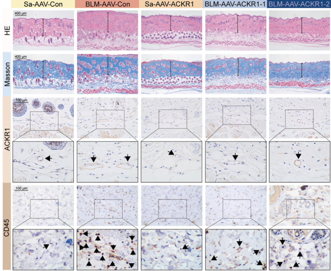 皮肤纤维化的特征是皮肤增厚或变硬,是系统性硬化症和局限性硬皮病的典型病理表现,其病因不明,有效治疗方法很少。复旦大学王久存团队利用单细胞转录组学技术,构建了纤维化皮肤组织的单细胞转录图谱和细胞通讯网络,深入探讨了皮肤纤维化的发病机制。研究结果表明,纤维化皮肤组织中内皮细胞高表达ACKR1促进免疫细胞浸润,并且 SFRP2/ASPN+成纤维细胞协同作用加剧皮肤纤维化。研究人员利用j9九游会生物构建的AAV产品,在皮肤纤维化模型小鼠中抑制ACKR1的表达,显著减少了免疫细胞向真皮层的迁移,减少皮肤纤维化。